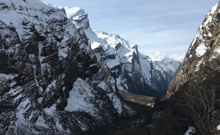 We made a leisurely beginning, taking the better part of an hour to finally leave Deurali after breakfast. Temperatures were scorching in the upper valley. A facet of the lightened atmosphere, or simply the weather joining in on our ‘summit day?’ Impossible to say, but I found myself cursing my choice of pants every step, all morning, as we negotiated our way up the snow-covered trail.
