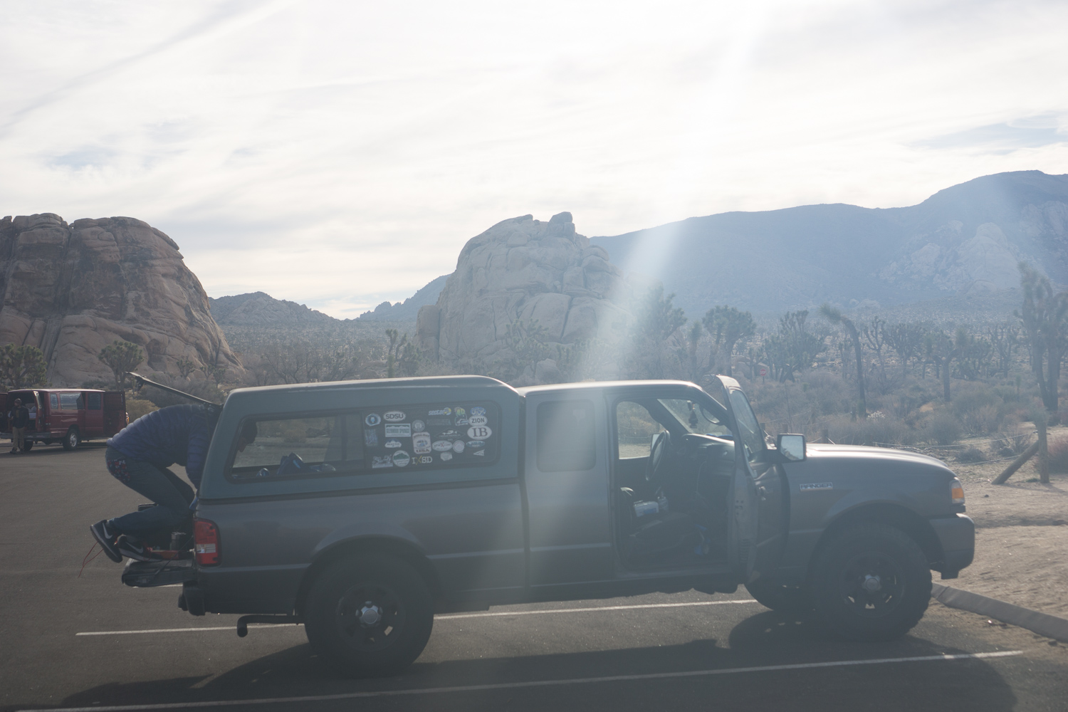 No worries, he says with a smile. I’ll dirtbag it in the back. In a flash, he clambers up over the tailgate and squirms his way into the back of the bed. He’s sitting on an assortment of irregularly-shaped metal climbing gear, but he doesn’t seem to mind. Jose and I hop up front. He gives us a slap on the window to let us know he’s good to go, and we hit the loop road, driving towards our climb.