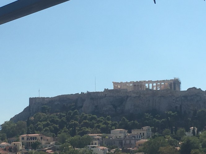 At one end of the complex there is a giant Greek flag, visible from many parts of the city. There is a crowded pedestal upon which this flag sits, where many tourists go to take photos.