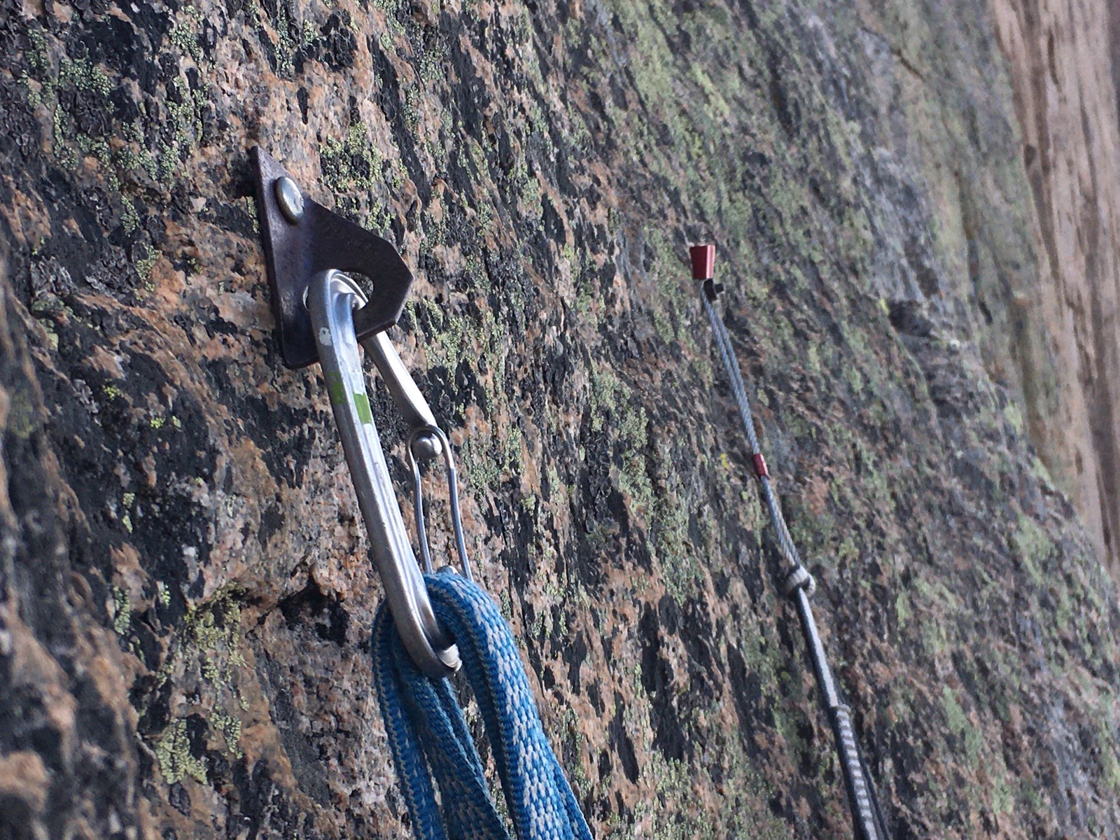 A few pieces of climbing gear stuck into cracks in the rock and some short nylon tethers are all that keep us from dropping to the glacier below. We aren’t all attached to the same gear — but our anchors are built around each other, at the only possible stance. The wall is too smooth and vertical to spread out much.