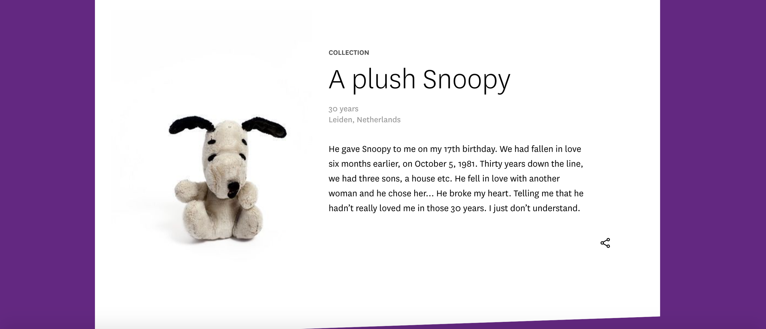You can browse a small selection of objects and their stories on the Museum’s website. There is also an interactive world map where visitors can leave a pin or a story about their heartbreaks.