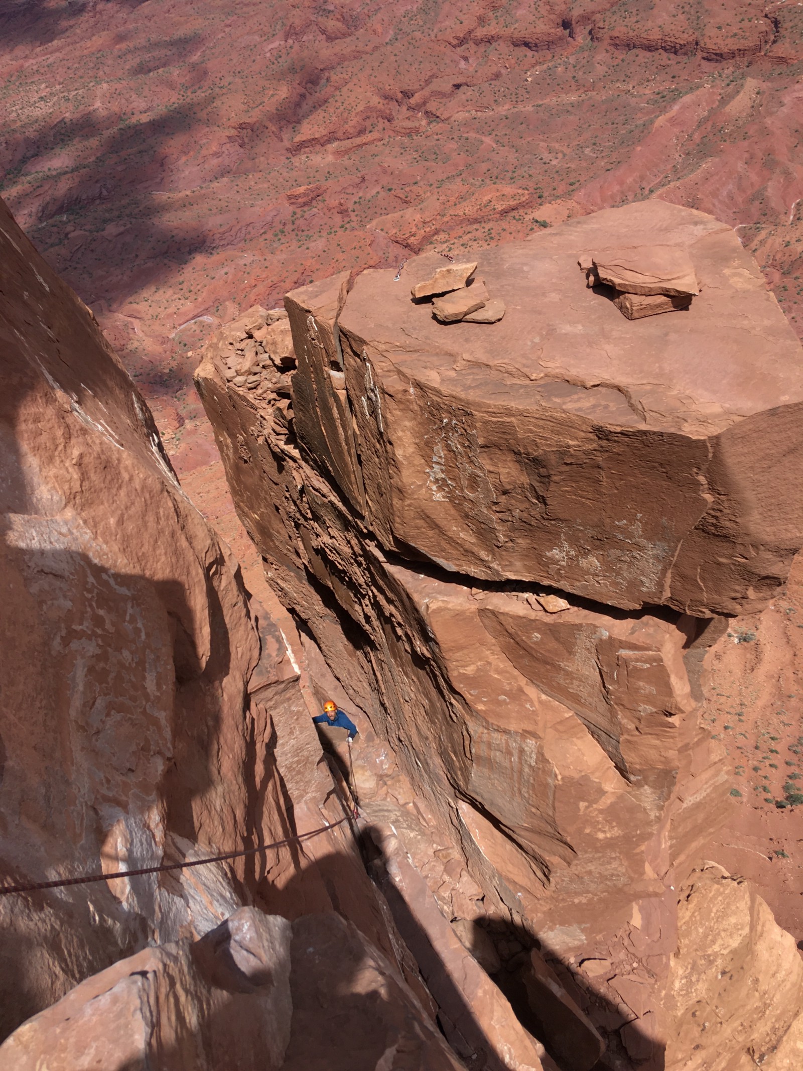 I had climbed Castleton via the Kor-Ingalls route (5.9+) last spring. This time we climbed the North Chimney route (5.9), technically the easiest climb on Castleton Tower (although in my opinion, the North Chimney route is more sustained than the Kor-Ingalls). We did NOT fly off 😉
