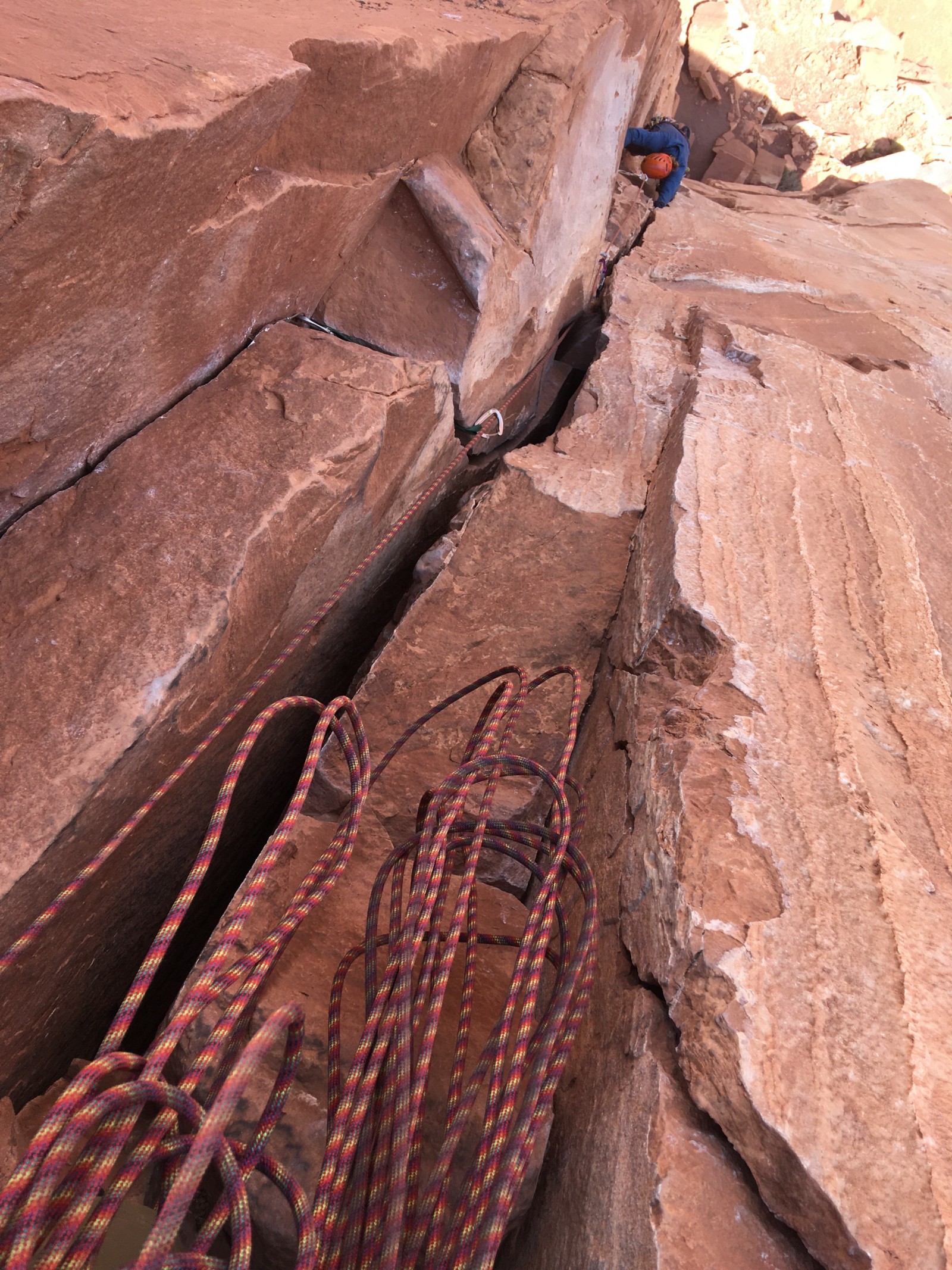 Pitch 1 is the most sustained part of the climb, a long vertical section of#3 hand crack with plenty of face and foot holds which make things a bit easier than climbing straight-in Indian Creek style splitters (which we had been doing for several days prior to this). Having triples in hand-sized cams is nice for this pitch if you protect conservatively.