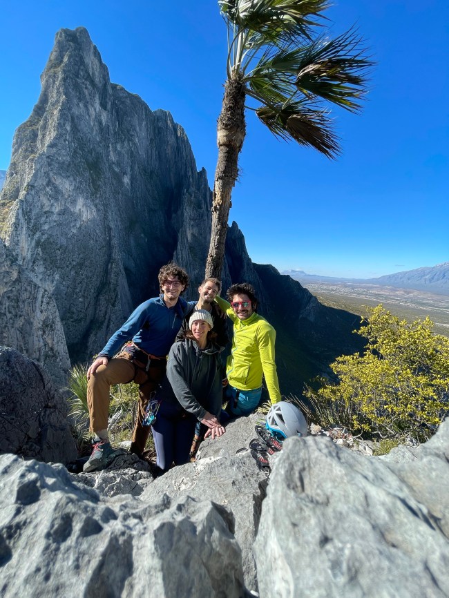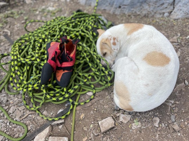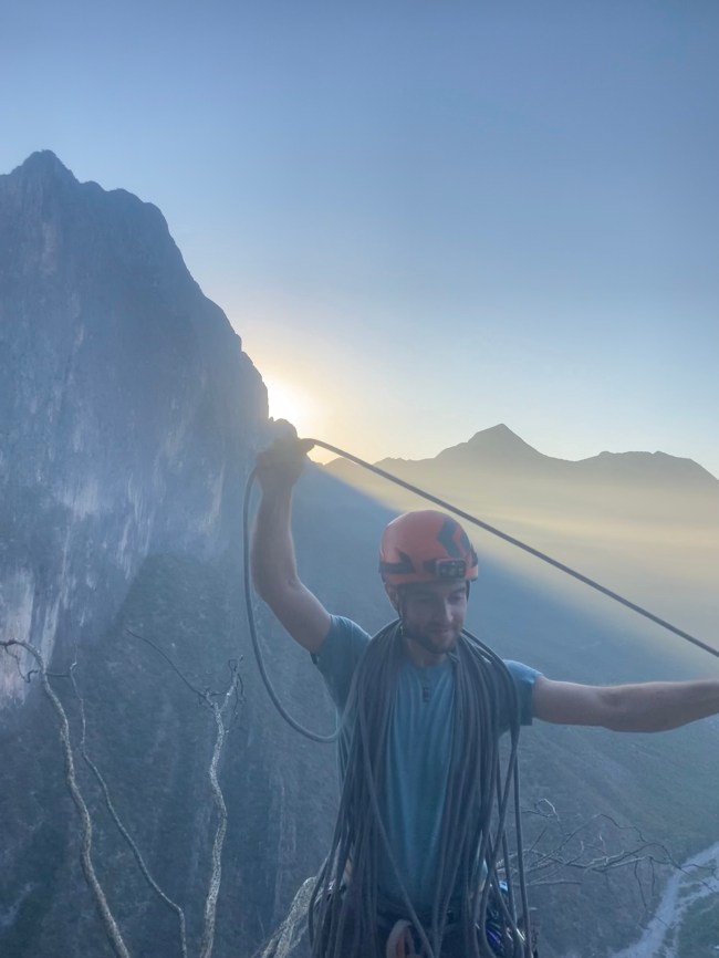 You climb up the bolt line for 12 pitches, clipping a bolt every two meters or less, hit a ridgeline or an arbitrary end point, and then coil the rope and prepare to rappel those same 12 pitches down. You yell “cuerda!’ to alert the party below that your rope will soon be landing in their face. They yell back: “What?!” and you say again, this time in English: “Rope!!”