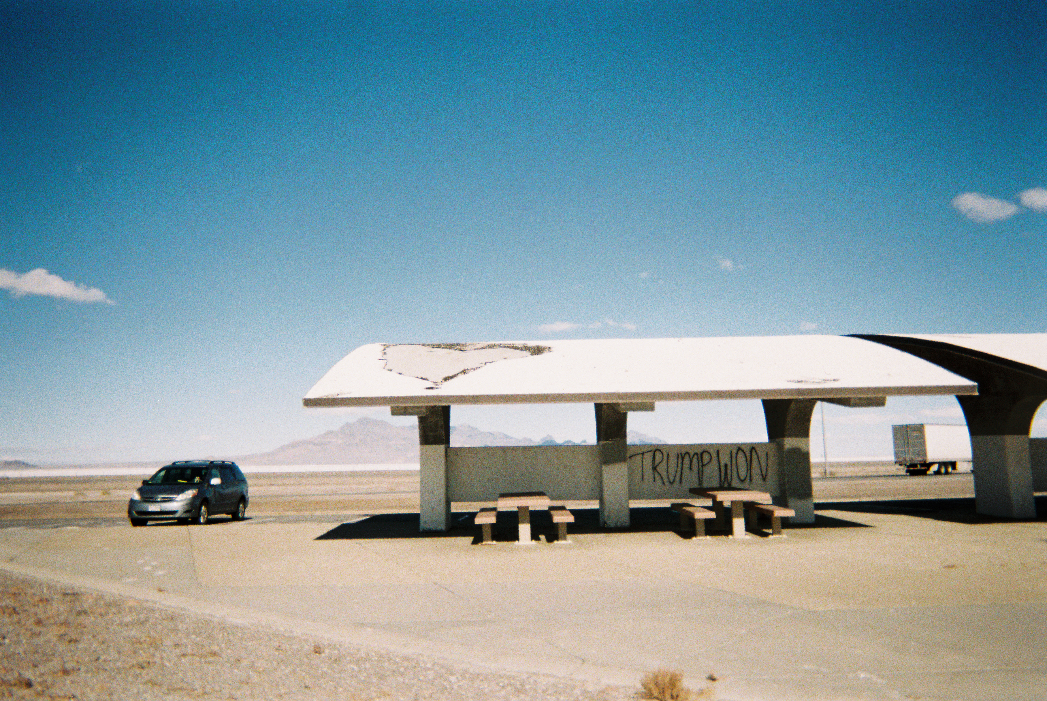 “TRUMP WON” graffiti on a rest stop, Bonneville Salt Flats, Utah.