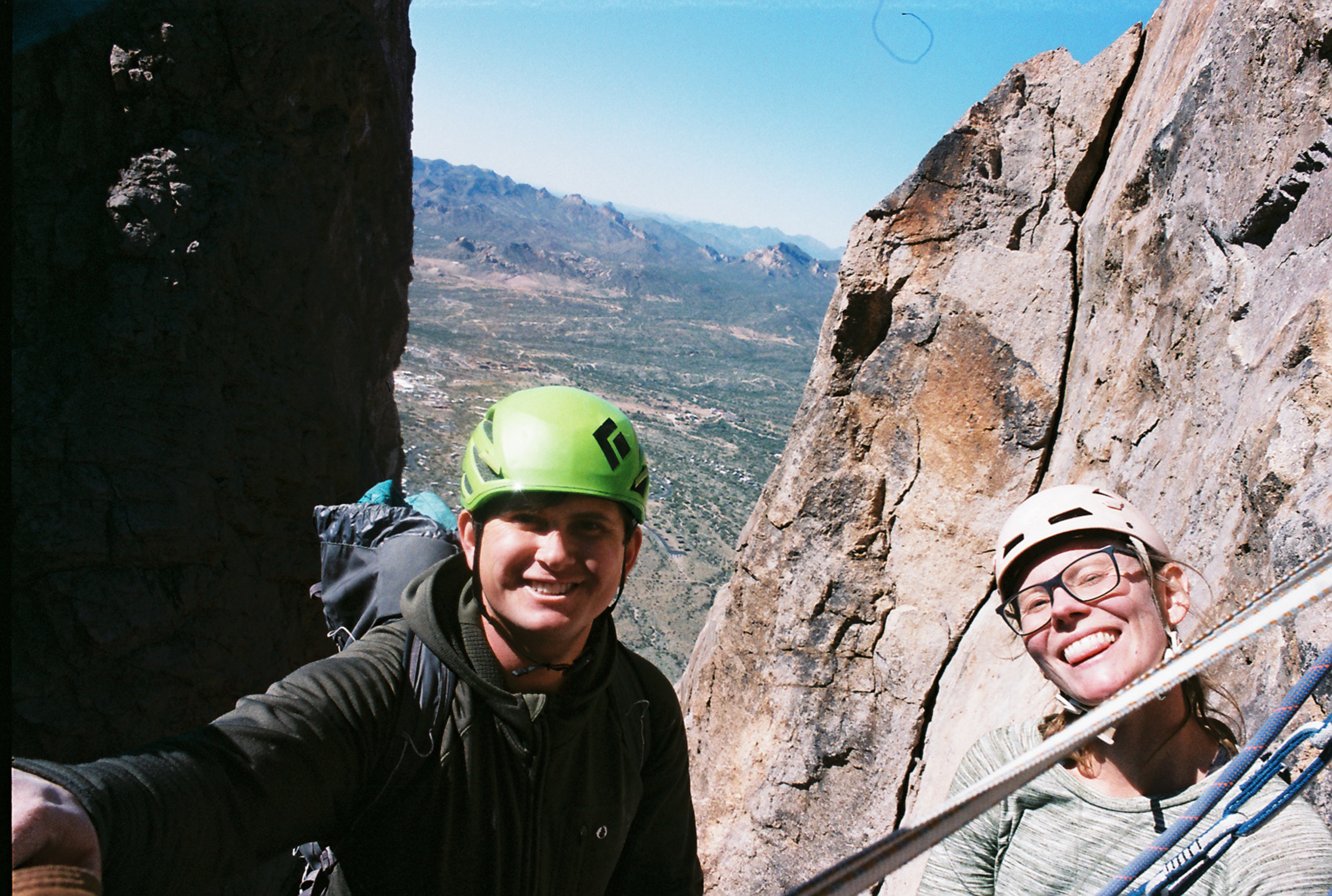 We listen to the voices from below for a few minutes. “That sounds like Scott’s laugh,” doesn’t it? Will and Sara confer, before agreeing that yes, it does. Will and Sara give a call from the top of the tower, loud as they can: “DONKEYS RIDE!” We receive an immediate answer – it is the Donkeys down below, Phoenix’s local climbing club/ degenerates.