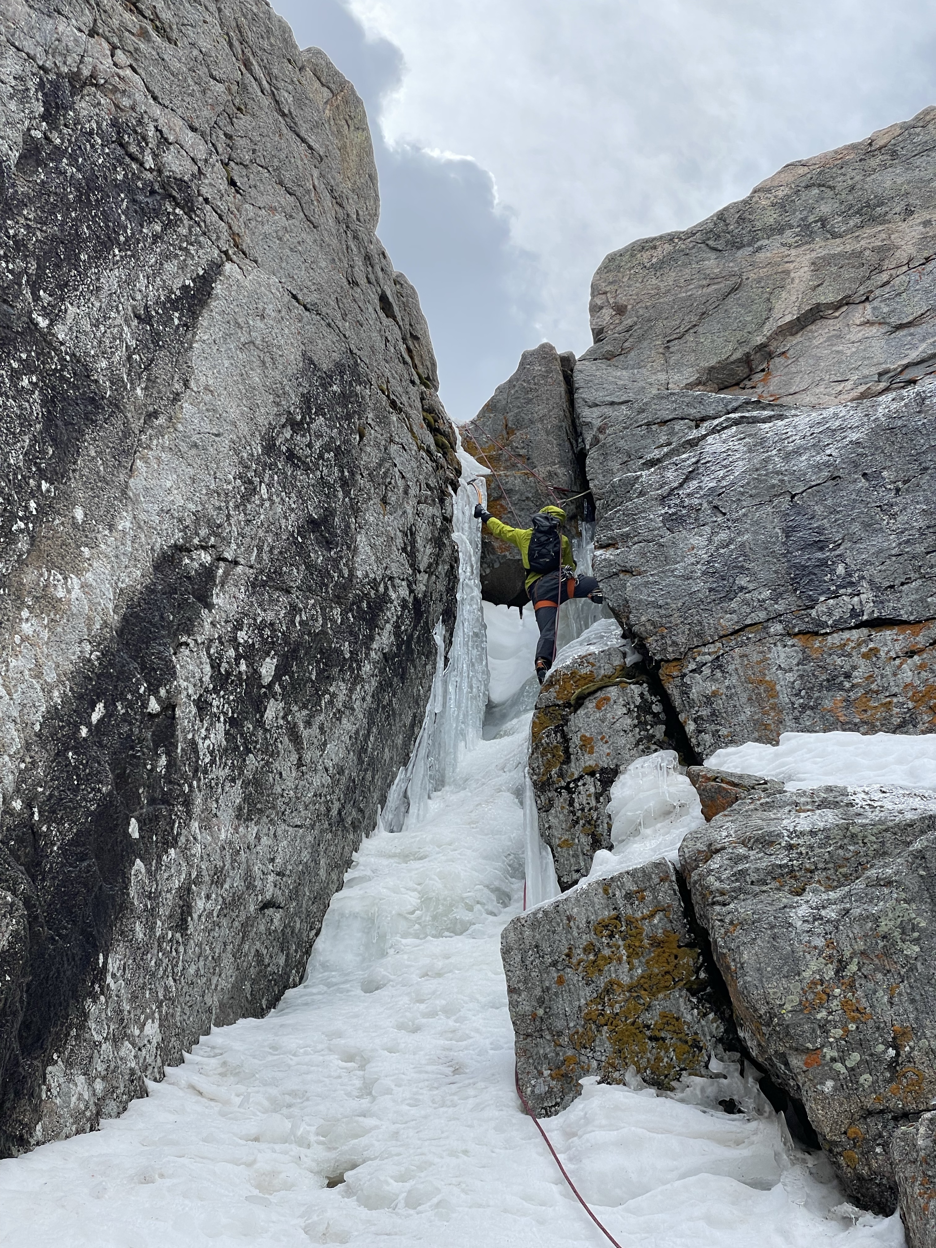 For gear, we brought 2x 10cm ice screw (red), half set of stoppers, half set of cams, two pins and six draws. A 50 meter rope was sufficient to belay the cruxes.