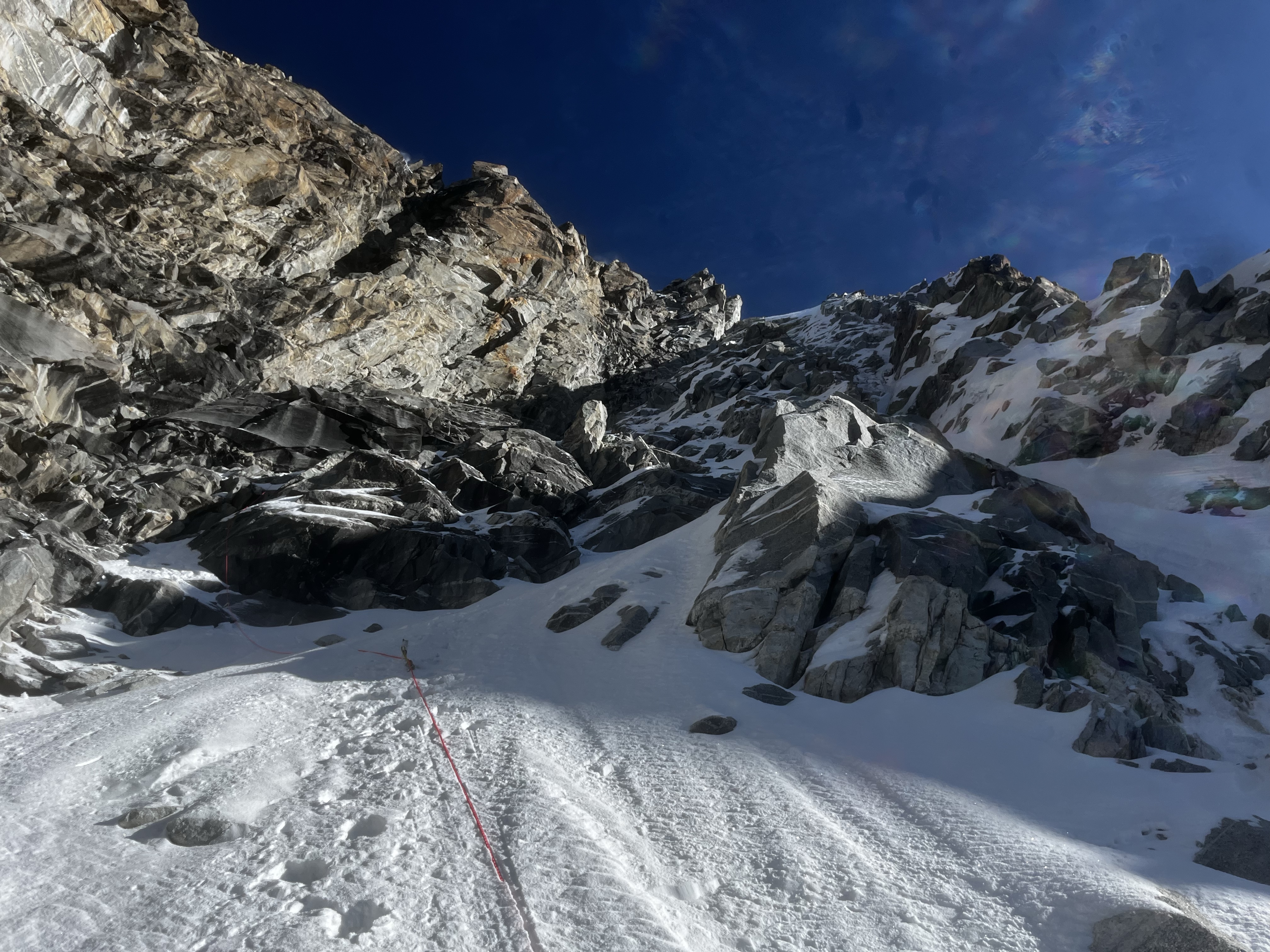 Sorry is about all I can say. He doesn’t want to go down, which speaks to his mettle as a mountaineer. Setting solid rappel anchors in the terrain we just went up would have been difficult, so I’m relieved he still feels ok to advance. He even wants the next lead.
