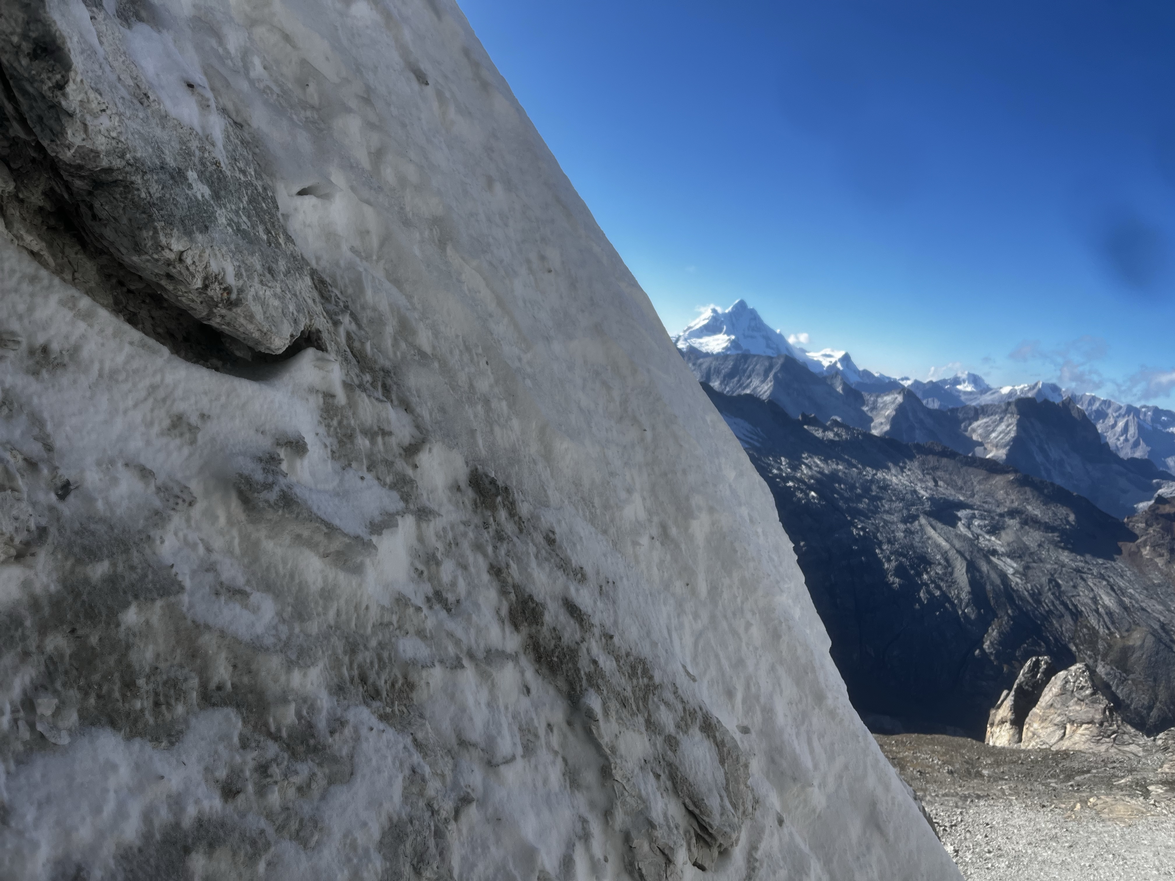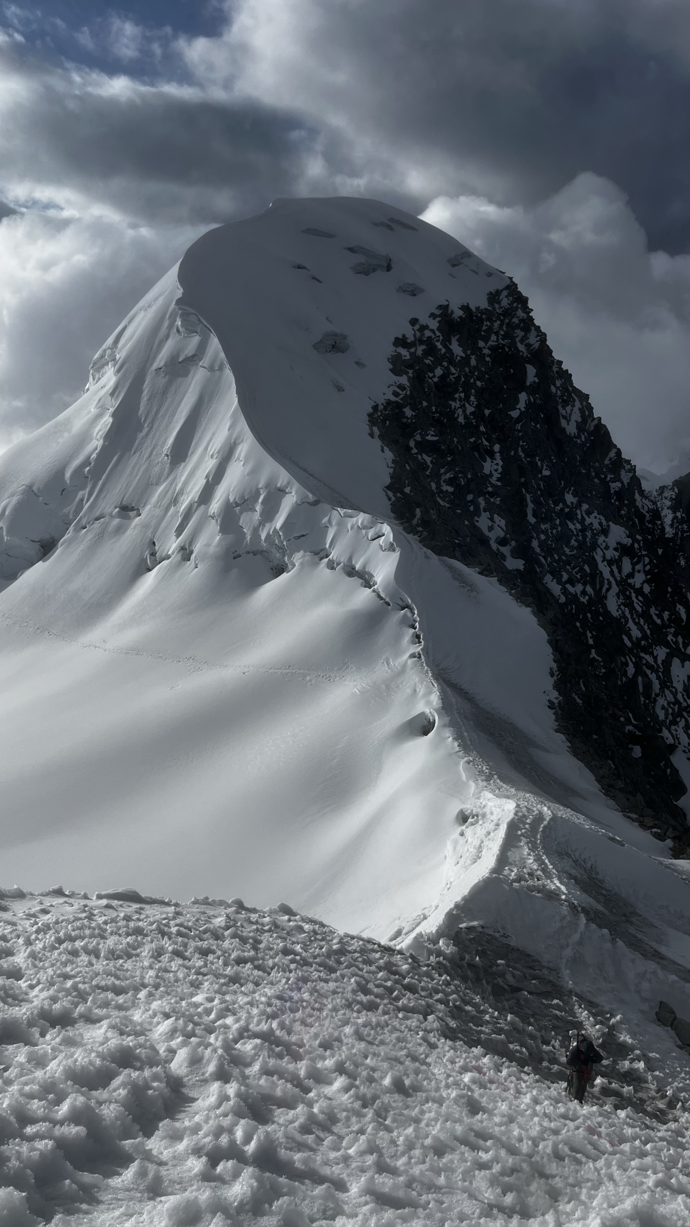 Cornices are a big problem in the Cordillera Blanca. A cornice, for those who don’t know, is a big crest of wind-blown snow on top of a ridge. While they look super aesthetic and impressive, cornices are highly dangerous to mountaineers because they are difficult to assess from the windward side. It is hard to know where is solid mountain or glacier, and where is overhanging cornice.