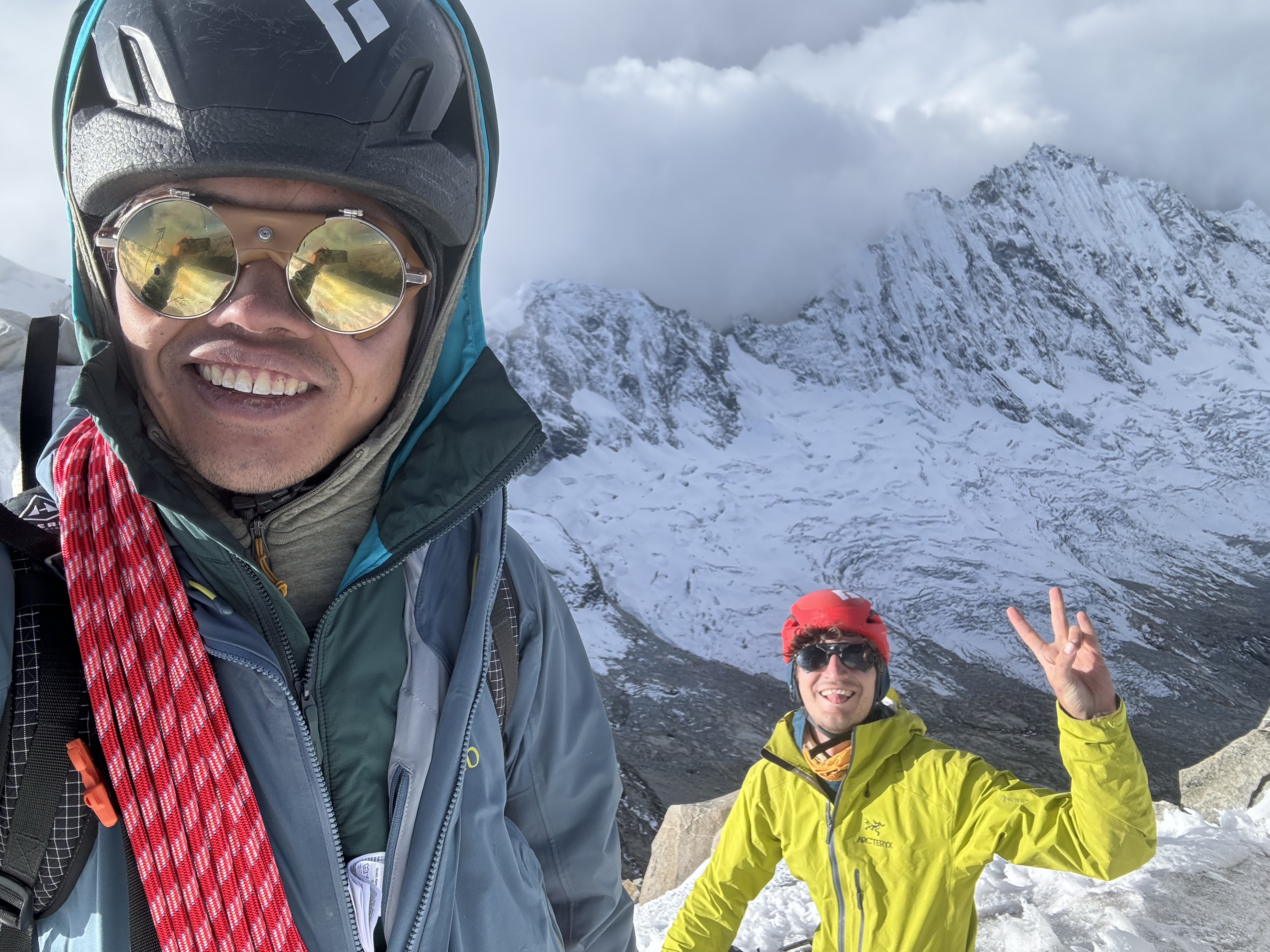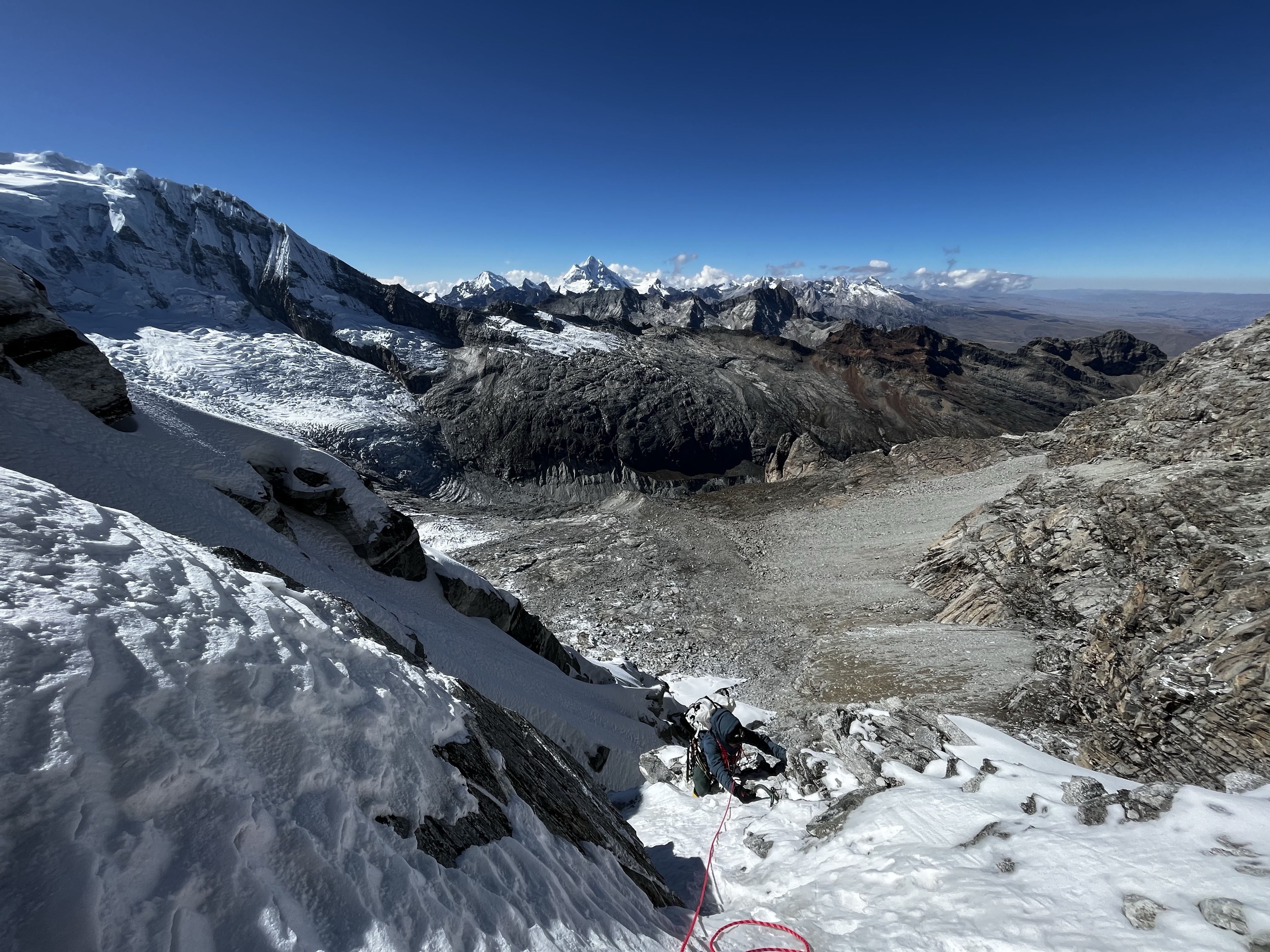 Calum follows up without problem, thankfully not testing the belay. This is a decision point: we can either attempt to descend the gully we just came up, or we can continue on towards the summit of Vallunaraju, and down the other side. Thankfully, we are on the same page: descent would be time-consuming, difficult and dangerous. Adelante. We go on.
