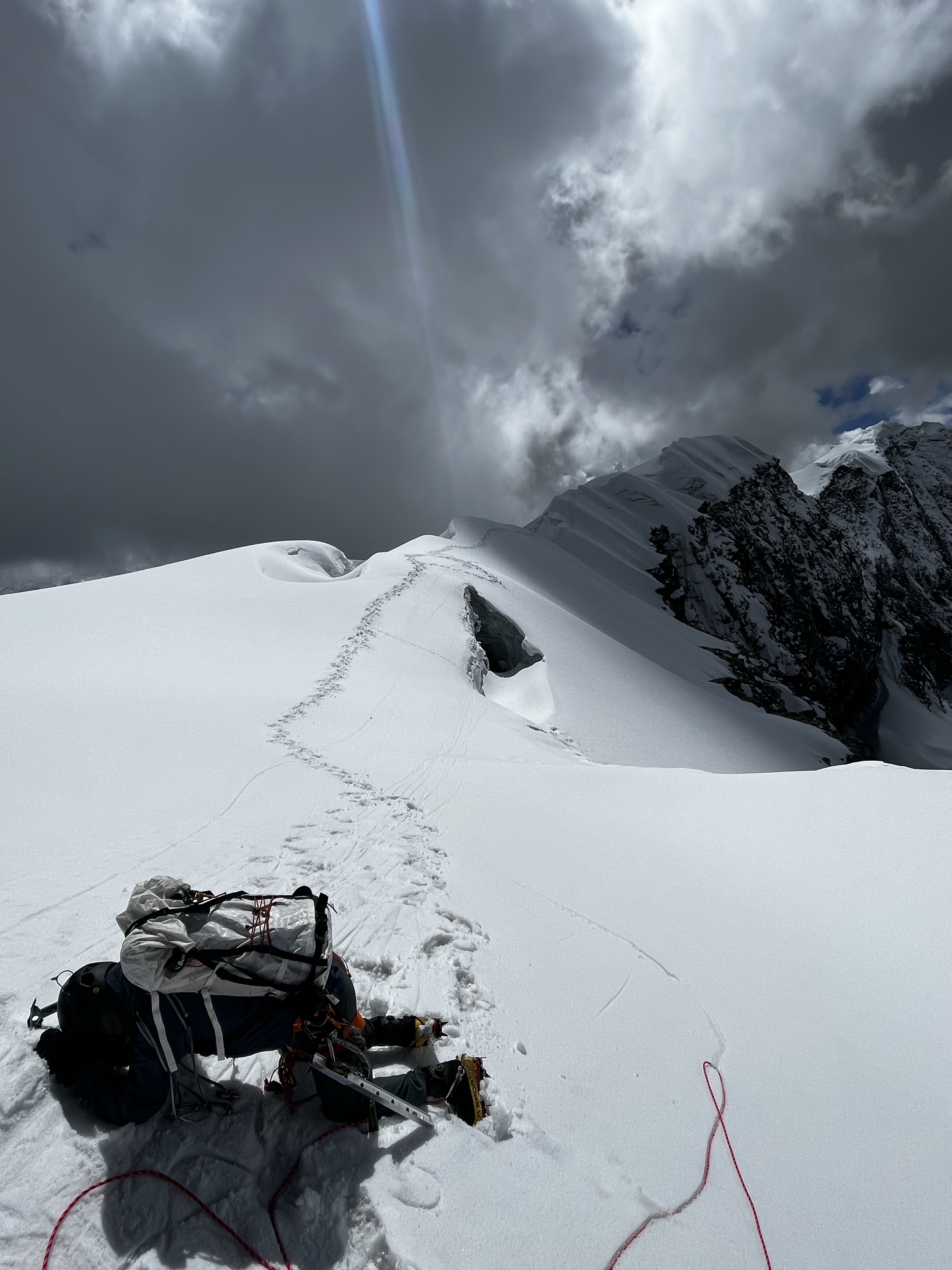 Our path to the summit takes us along a corniced ridge. Thankfully, we seem to have topped out in a slightly more secure spot, and I can take a hurried glimpse along the ridge line. There’s some cornice, and a gaping crevasse below, but the overhang doesn’t seem to be massive. The ridge should be safe to traverse as long as we stay a little lower. Our only issue is protection: we have only brought three snow pickets with us, and one is in the anchor. Calum takes the lead 70 meters, places a picket with a microtraxion, and I simulclimb for 70 meters, until he places another picket and belays me along. We swap spots and do the same again: I take the lead for another 210 meters, which deposits us on safe, flat ground at the base of Vallunaraju’s North face. I belay off an ice screw, having spent both pickets on the ridge.