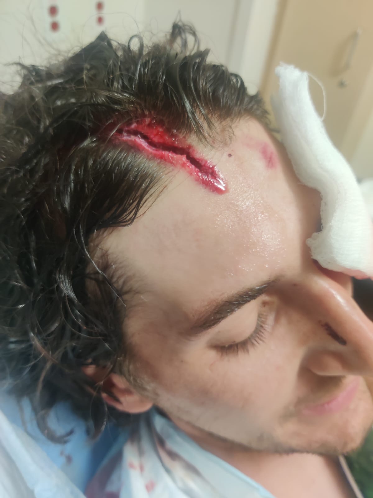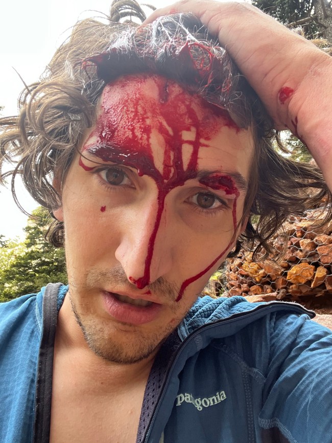 Blood dripped rapidly from above my eyes, staining my hands and my pants. “Down,” was all I could say, pointing at the ground. “Down, down, down.”