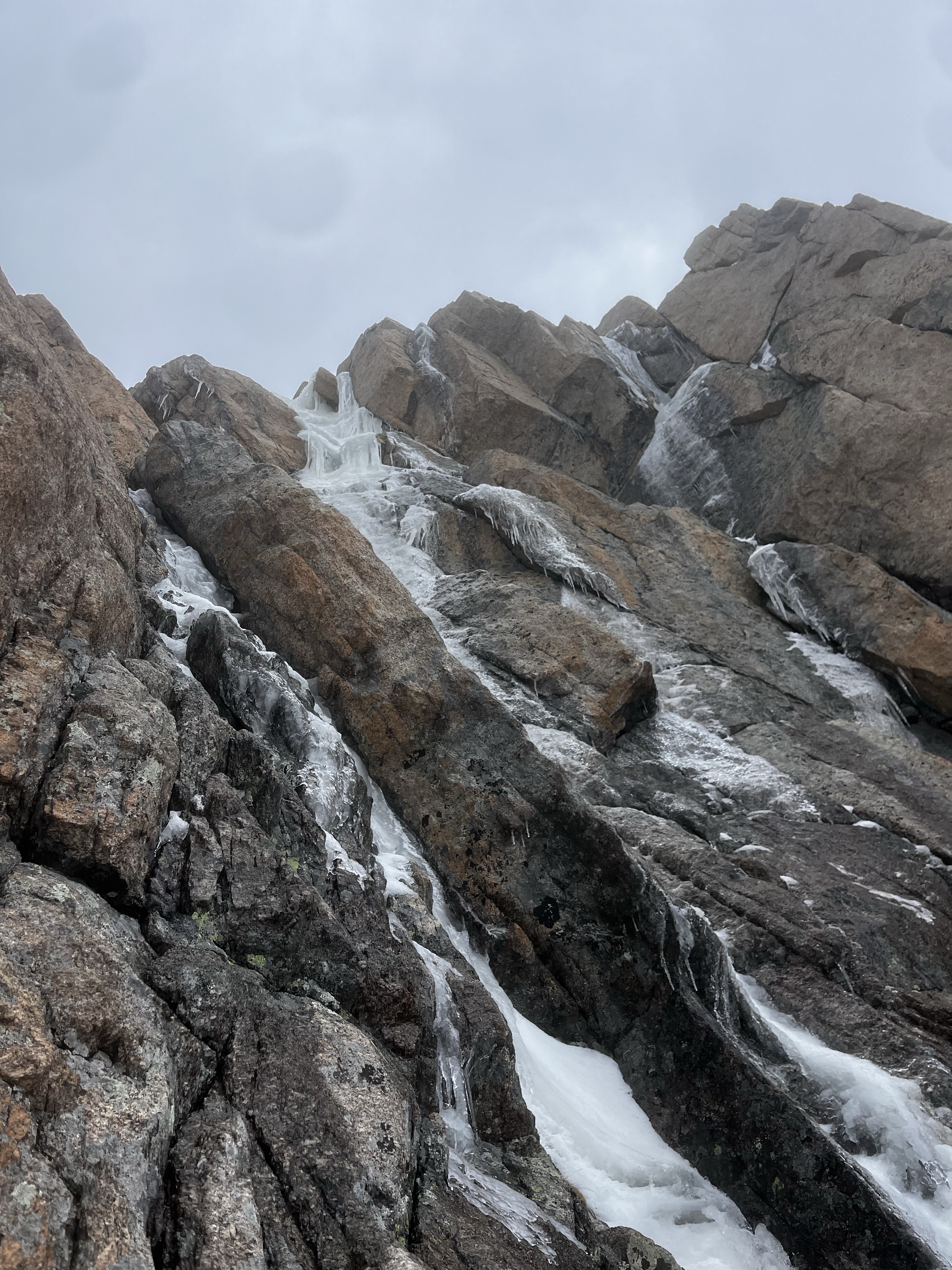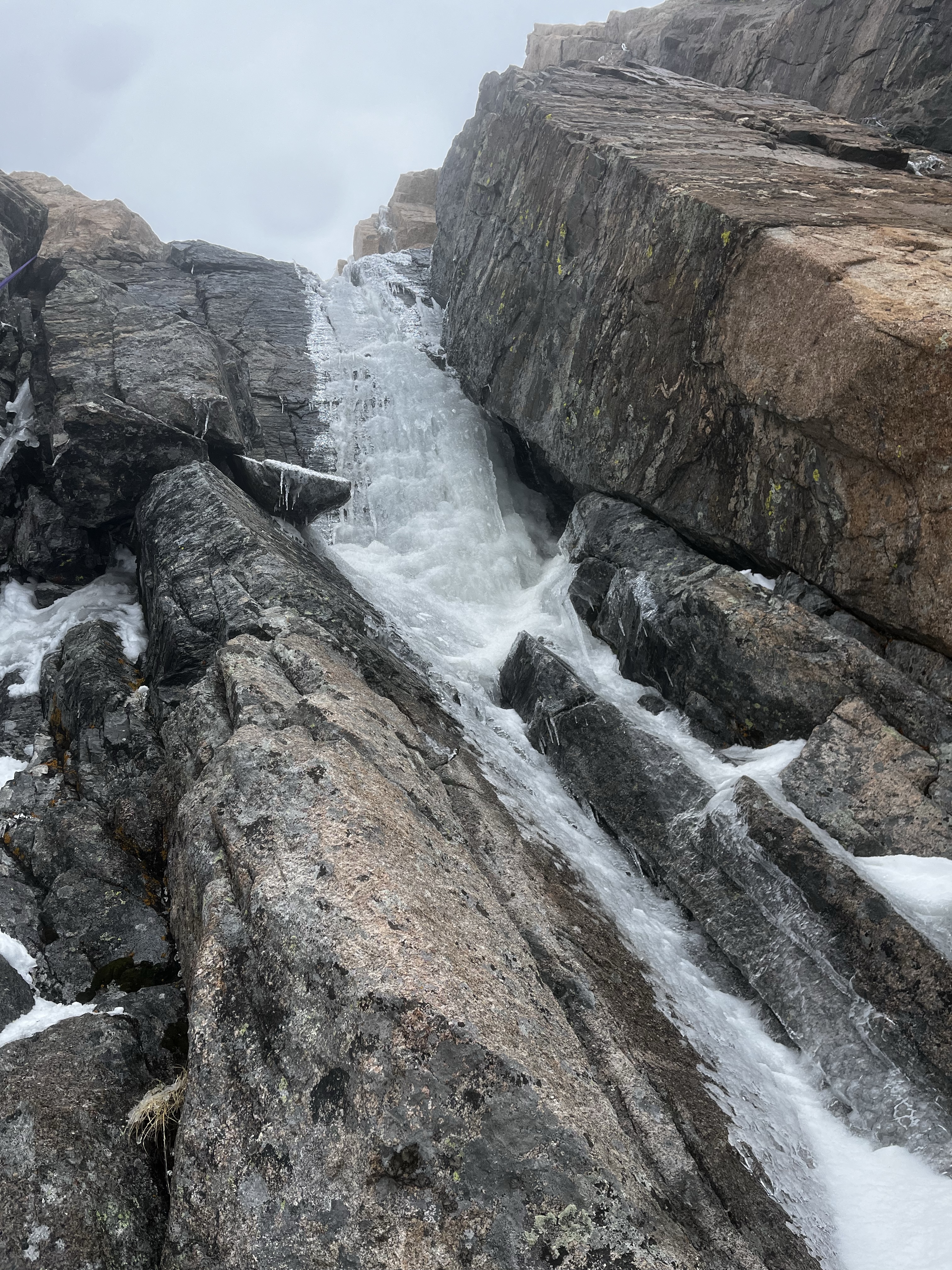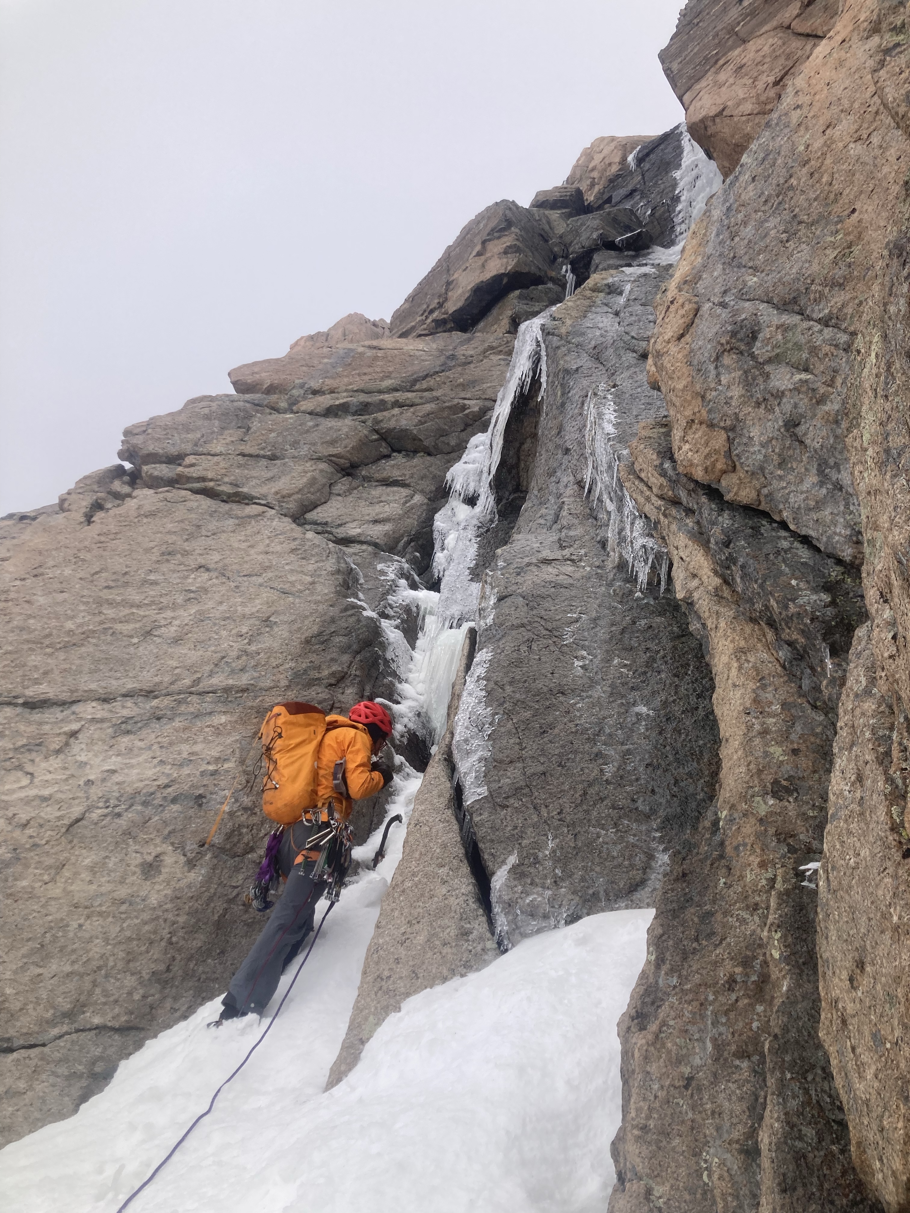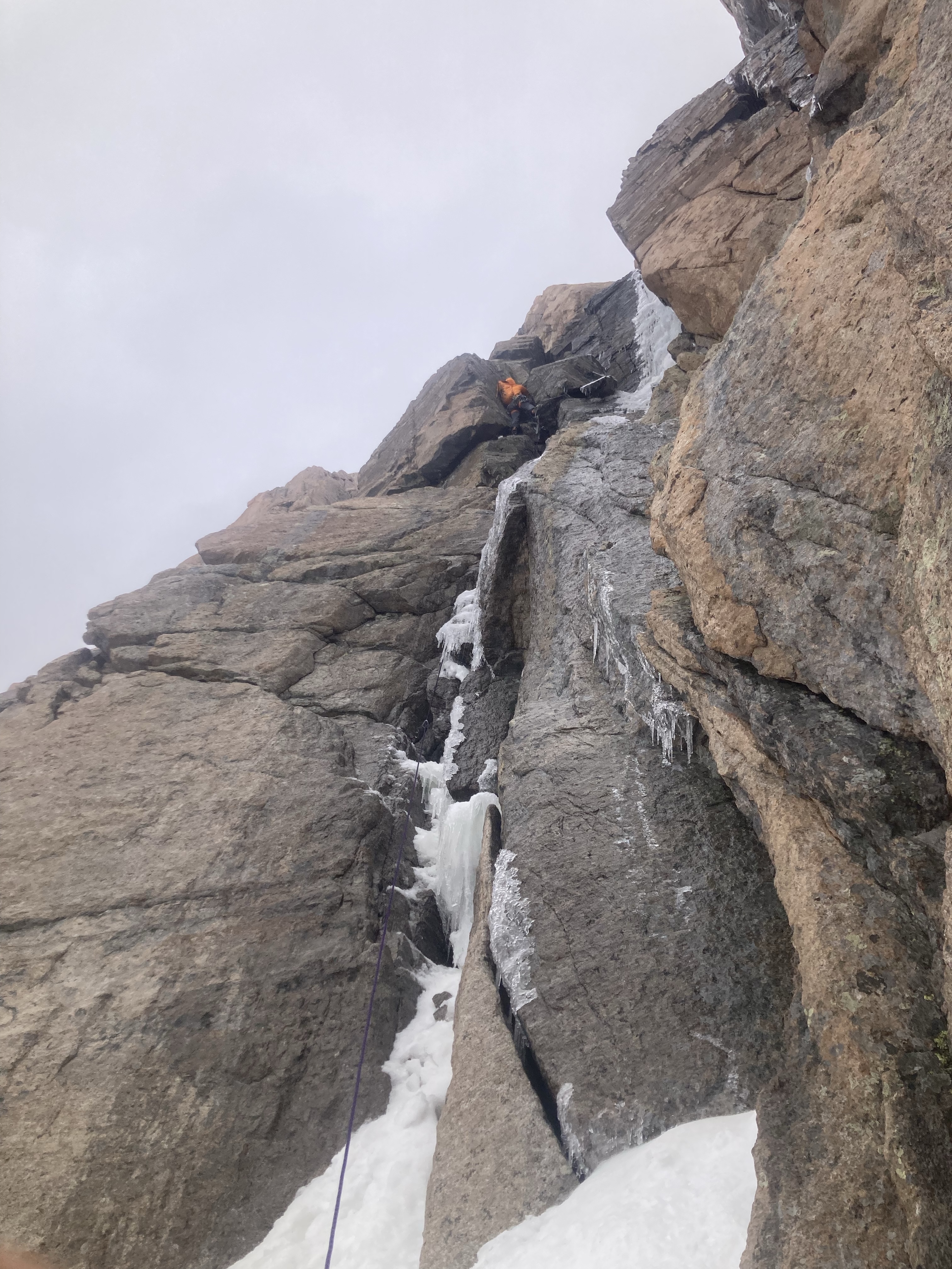 Lacee Ankeney and I went up to Chasm Lake in the Spring of 2024, planning to make a spring climb of Alexander’s Chimney. When we reached the lake, we spied two ice flows on the cliffs of Mount Lady Washington which we had never seen before. It was a cloudy day, the perfect chance to climb these south-facing lines. We changed our plans and popped over to take a look. This was fortuitous for us, as RMNP SAR was searching for a lost hiker, and they ended up locating his body at the foot of Lamb’s Slide that day. We would have been the party to discover the body if we had continued with our original plan.