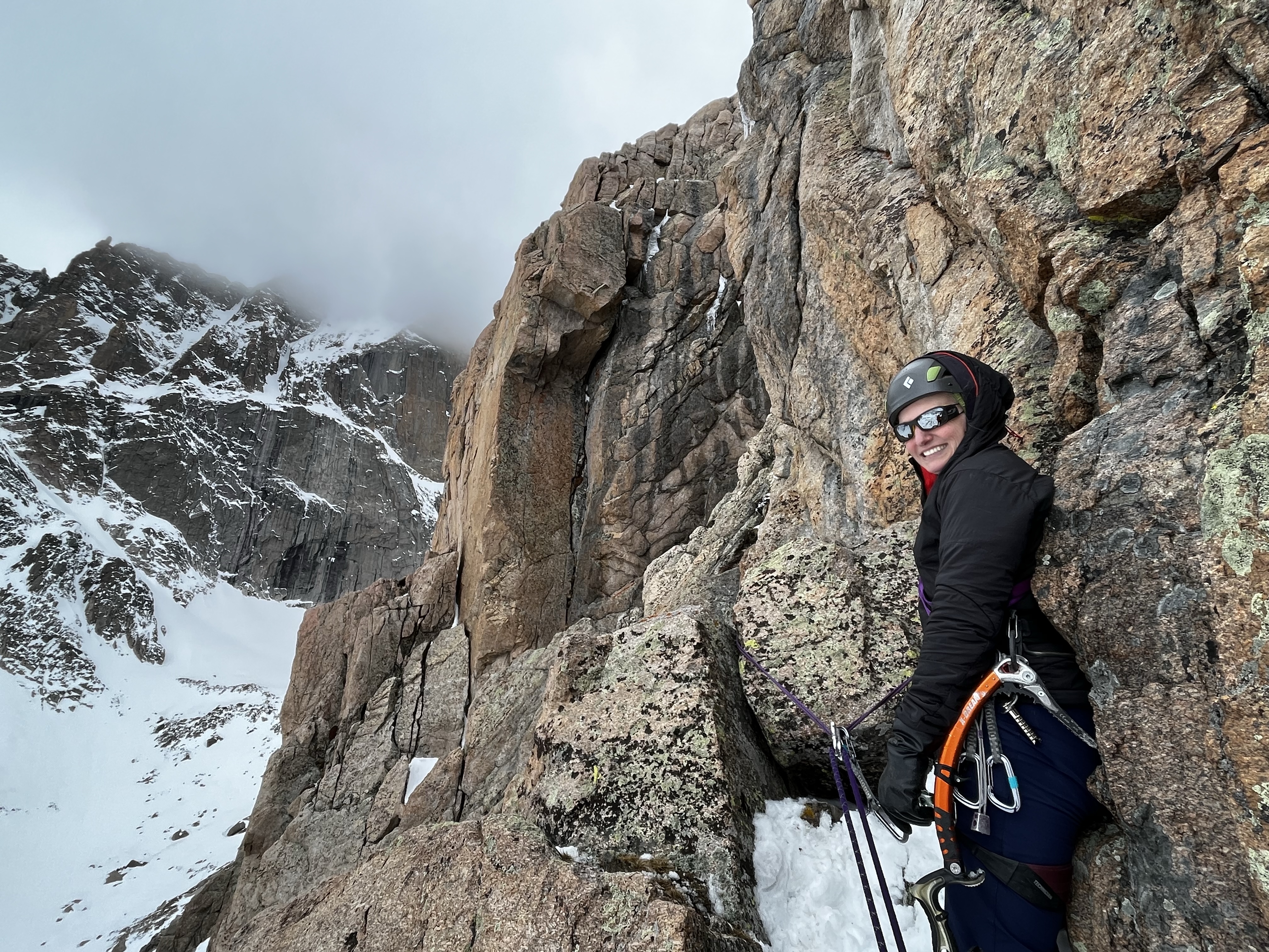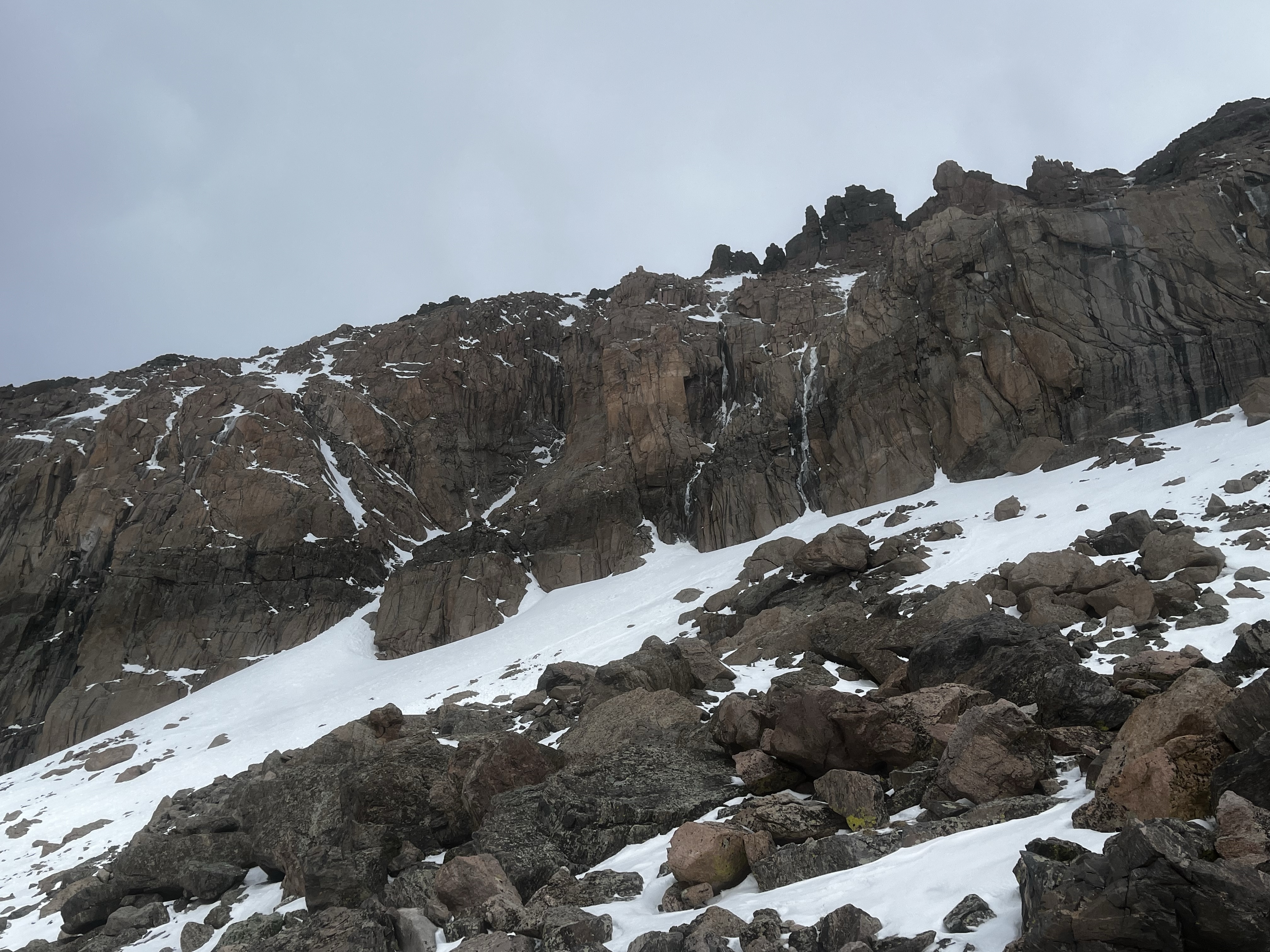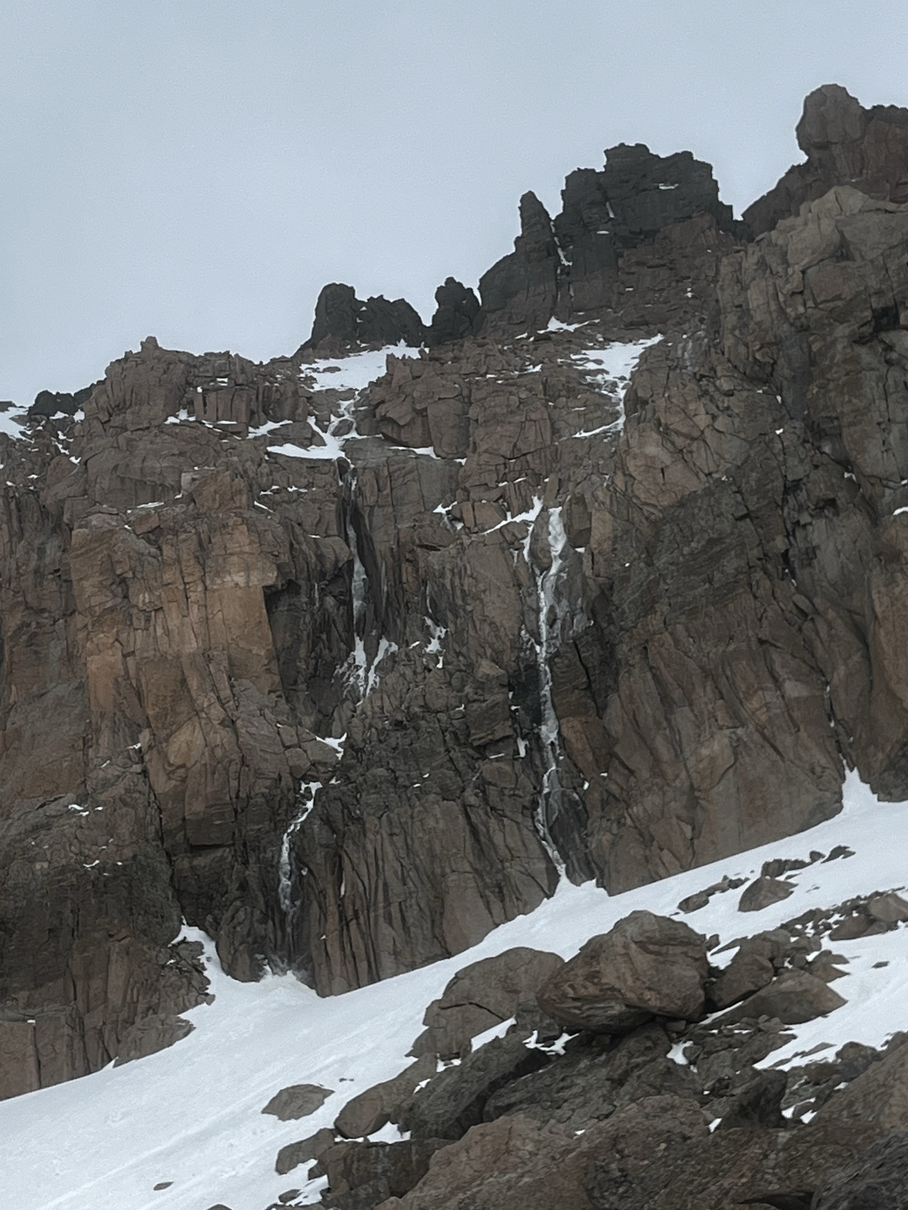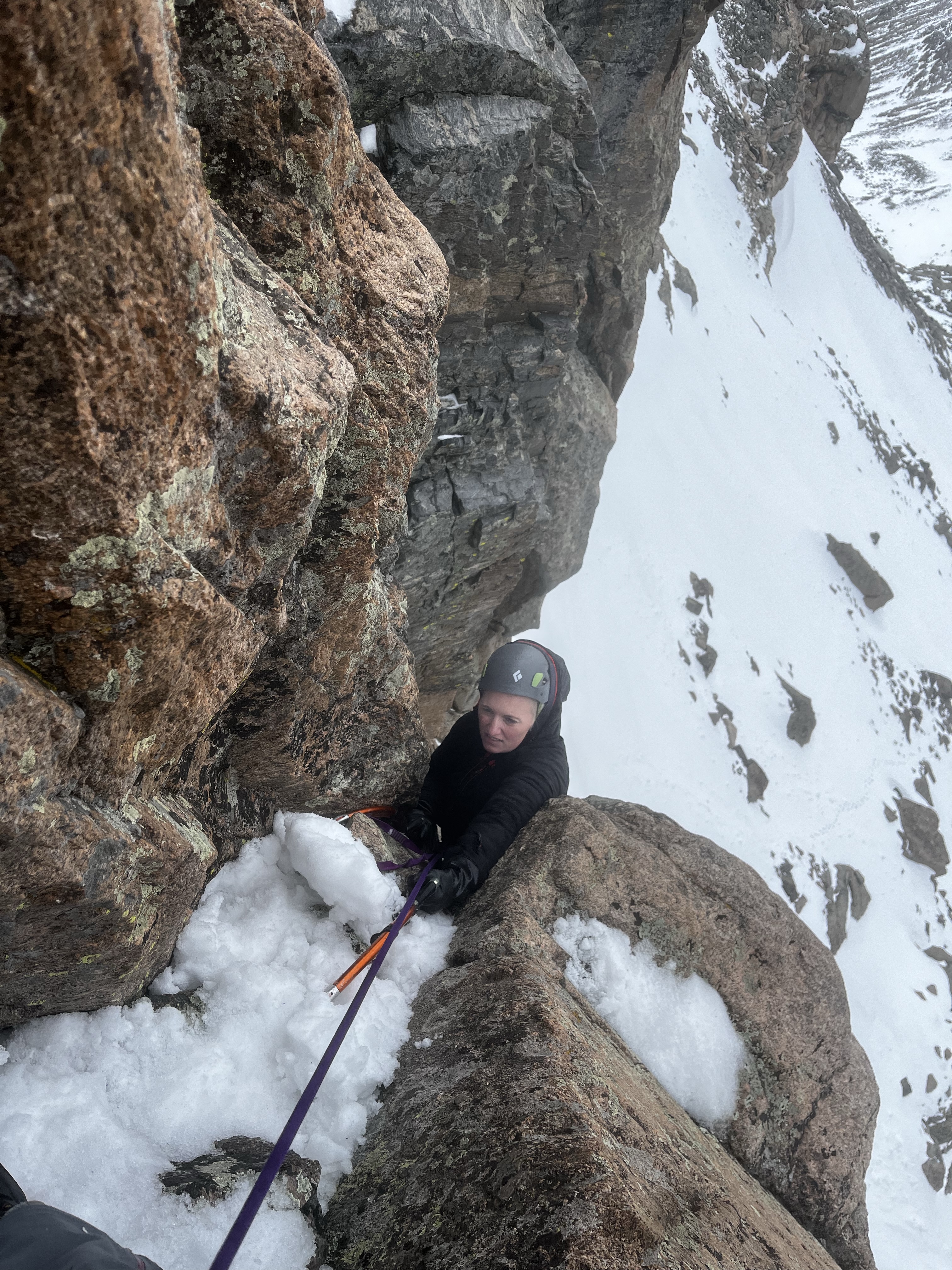 Lacee Ankeney and I went up to Chasm Lake in the Spring of 2024, planning to make a spring climb of Alexander’s Chimney. When we reached the lake, we spied two ice flows on the cliffs of Mount Lady Washington which we had never seen before. It was a cloudy day, the perfect chance to climb these south-facing lines. We changed our plans and popped over to take a look. This was fortuitous for us, as RMNP SAR was searching for a lost hiker, and they ended up locating his body at the foot of Lamb’s Slide that day. We would have been the party to discover the body if we had continued with our original plan.