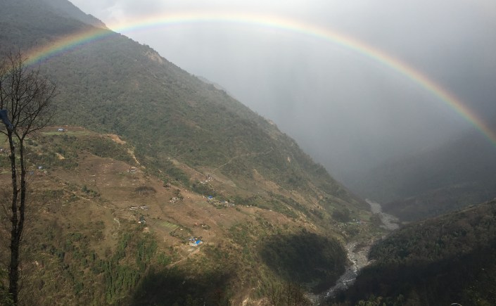 We had just descended what felt like a thousand steep steps. My knees were creaking; Saffron was leaning on my trekking poles while gasping; Anker was sweaty but whistling cheerily. “We stop here,” he said, as we walked into Chhomrong.