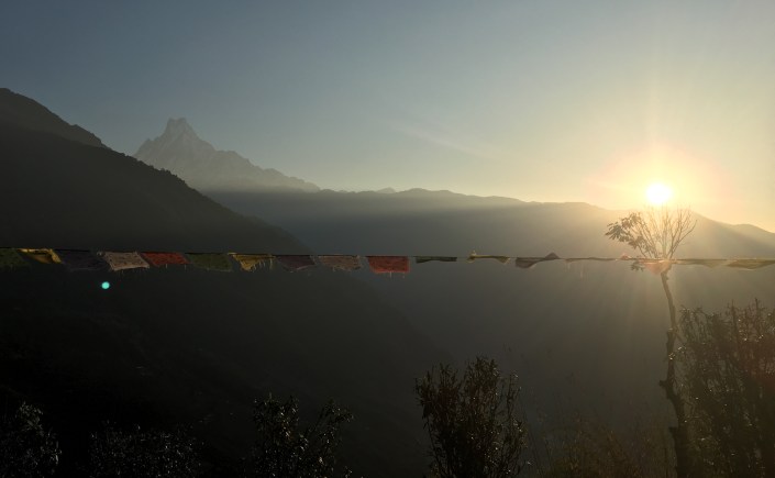 I walked back to the lodge as the morning sky was beginning to fill with light. It was a clear, brisk morning. The valley was beautiful, quiet and peaceful. You could see for miles. Far off, in the distance, the distinctive silhouette of of the Fishtail poked out of the horizon. Although the real name is Machupuchre, the mountain has acquired the English nickname “Fishtail” because of its obvious resemblance, from certain angles, to a fish’s tail.